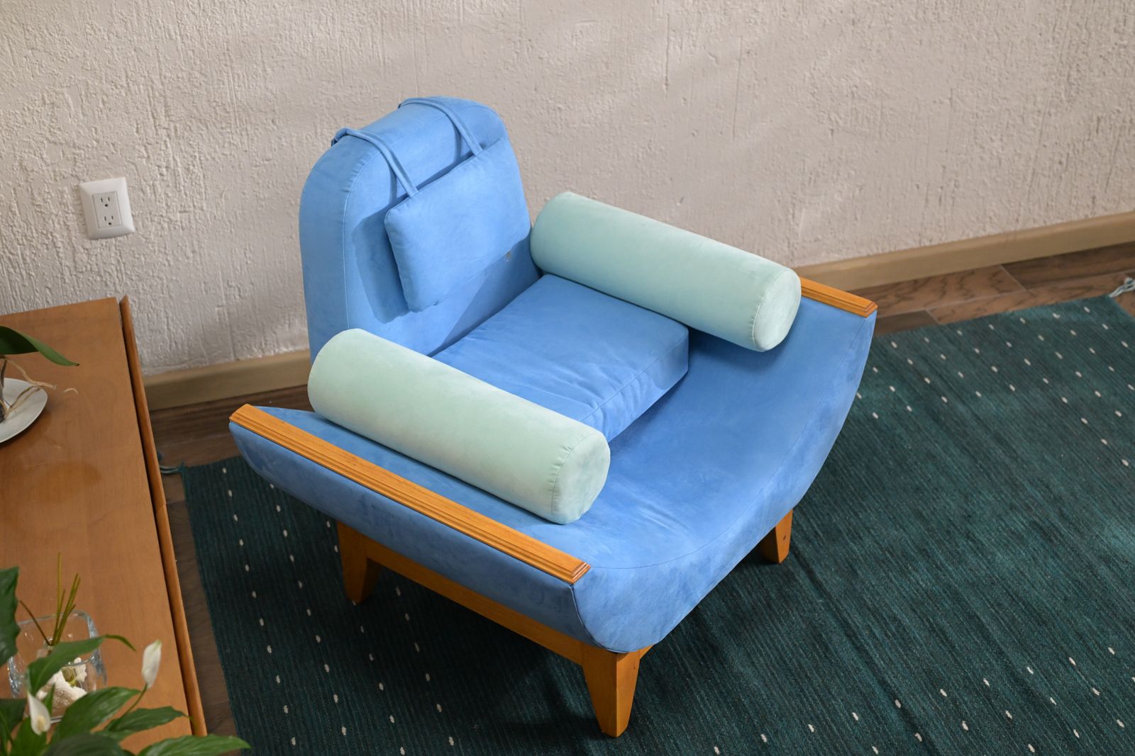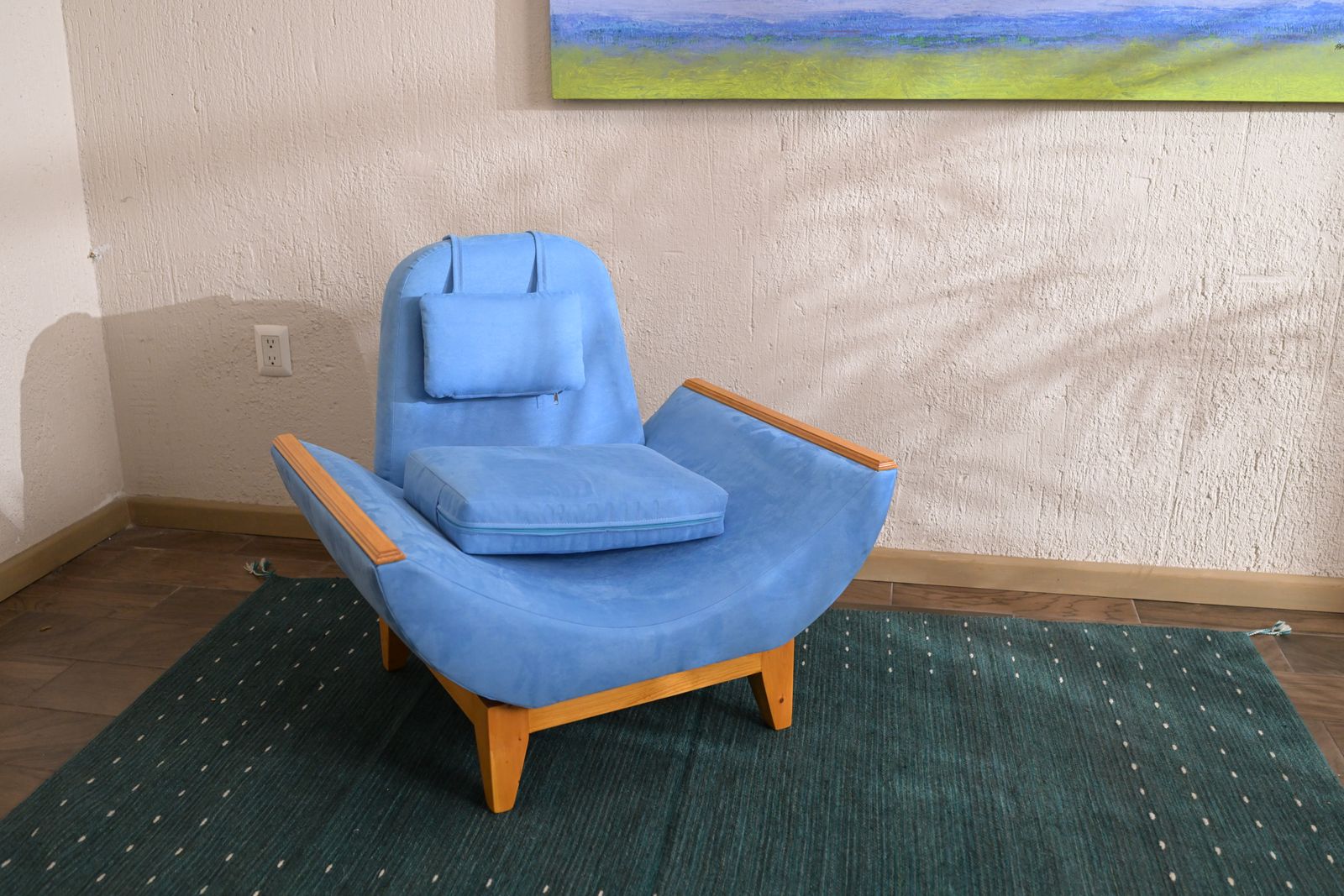 Un sillón de líneas modernas y estructura robusta de madera, diseñado para ofrecer un confort superior mediante un sistema de acolchado avanzado que se adapta al peso del cuerpo.